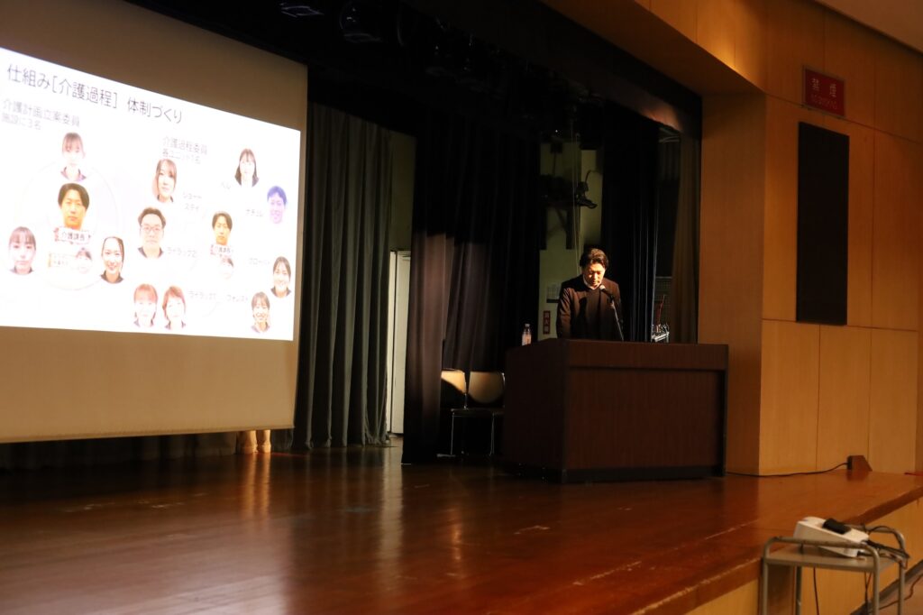 共同発表では、介護実習での学びで「外国人介護職による認知症利用者さんへの支援」、「利用者様の生活視点」〜気づきを繋ぐために〜、「食」〜食への思い〜について3グループの発表がありました。
